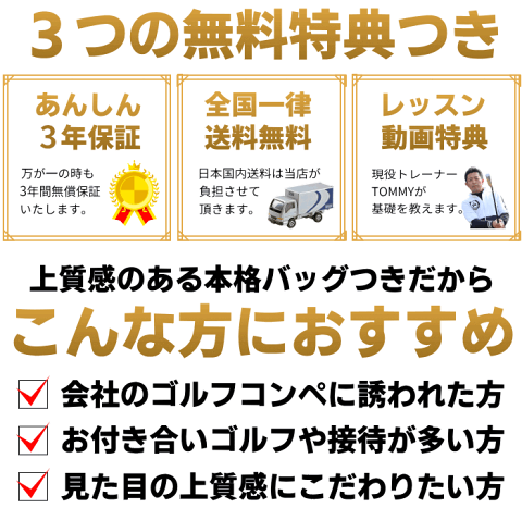 番手 1W 3W 7U 7I 8I 9I PW SW PT ロフト(°) 10.5 15 24 35 39 43 47 56 - 長さ(インチ) 45 43 39 37 36.5 36 35.5 35.25 34 総重量(g) 310 350 370 430 440 447 455 455 515 硬さ MEN's FLEX(SR相当)のみ 素材 ジュラルミン ステンレス アルミ合金 シャフト オリジナルカーボン スチール ヘッドカバー あり なし あり キャディバック バック重量約2.9kg / フード・ネームプレート付属 ※スペック表数値は参考値となりますので、実際の商品とは多少の誤差が生じる場合がございます(誤差±2)