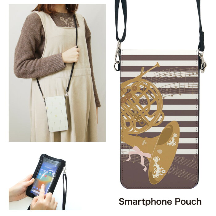 No148 ホルン スマホポーチ スマートフォンポシェット ポシェット iPhone Android タッチ操作対応 ショルダーベルト 肩掛け 斜め掛け ポーチ 合皮 帆布 ジャケット 吹奏楽 楽器 可愛い クラシック ボーダー 音楽 d:cut |