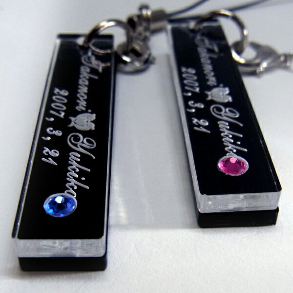 スワロフスキー製のラインストーンがポイント! 【名入れ】【ペアストラップ】詳細 ●素材:クリアーアクリル×ブラックアクリル ●ラインストーン:スワロフスキー製 ●カテゴリー:[携帯ストラップ] ●サイズ:縦4.5cm横1cm(2個セット) 【名入れ】【ストラップ】【携帯】【スマホ】【ペア】【カップル】【夫婦】【イヤホンジャック】【アクセサリー】【ギフト】【プレゼント】【記念日】【スワロフスキー】【誕生日】【結婚祝い】【いい夫婦の日】【敬老の日】【楽ギフ_名入れ】販売実績3000個突破!! 透明アクリルにブラックプレートを重ねたペアストラップ・・・ ふたりのお名前や記念日を刻めば世界にたったひとつ・・・ ふたりだけのオリジナルストラップが出来ちゃいます♪